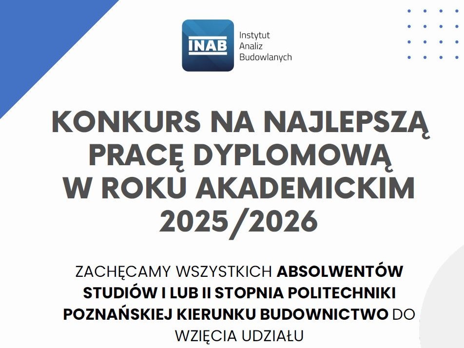 Instytut Analiz Budowlanych przy współpracy z Instytutem Budownictwa Politechniki Poznańskiej organizuje konkurs, w ramach którego wyłonione zostaną najlepsza praca inżynierska oraz najlepsza praca magisterska.