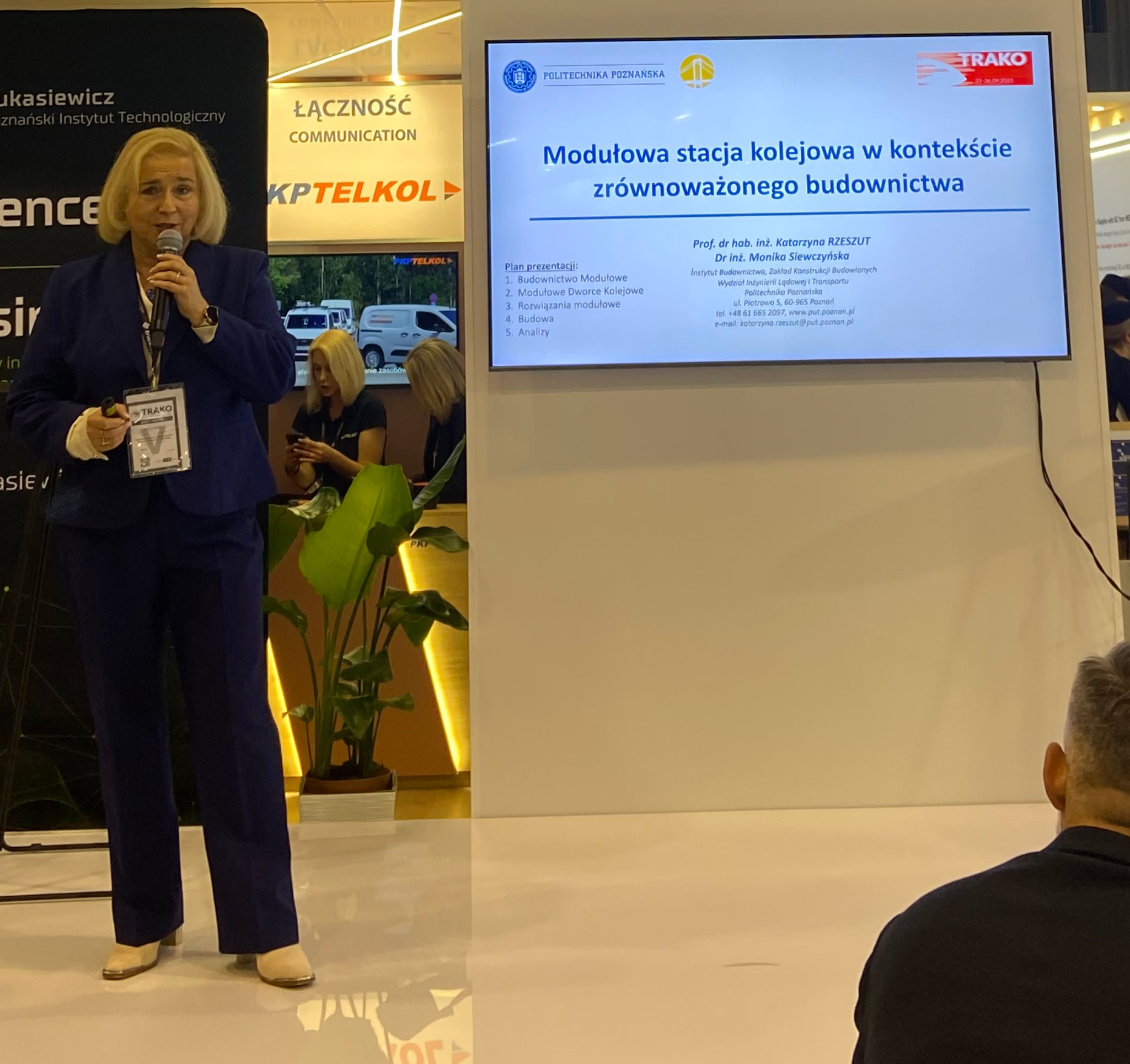Na targach Politechnika Poznańska była reprezentowana między innymi przez prof. dr hab. inż. Katarzynę Rzeszut (WILiT), która przedstawiła wykład nt. modułowej stacji kolejowej w kontekście zrównoważonego budownictwa oraz została zaproszona do udziału w debacie nt. prezentacji rezultatów projektów partnerstwa Europe’s Rail JU realizowanych przez ekosystem badawczo-rozwojowy PKP S.A. Podczas debaty pani profesor przedstawiła unikalność rozwiązań na poziomie europejskim na przykładzie Zielonego Modułowego Dworca podkreślając, że modułowość i elastyczność zaproponowanych rozwiązań budowlanych doskonale wpisuje się w trendy przyjęte na poziomie międzynarodowym w UE. Nawiązała również do innowacyjności koncepcji wypracowywanych przez ekosystem PKP S.A., które uwzględniają najnowsze trendy w zakresie redukcji emisji CO2 i rozwiązań wpisujących się w idee zrównoważonego rozwoju i gospodarki o obiegu zamkniętym.