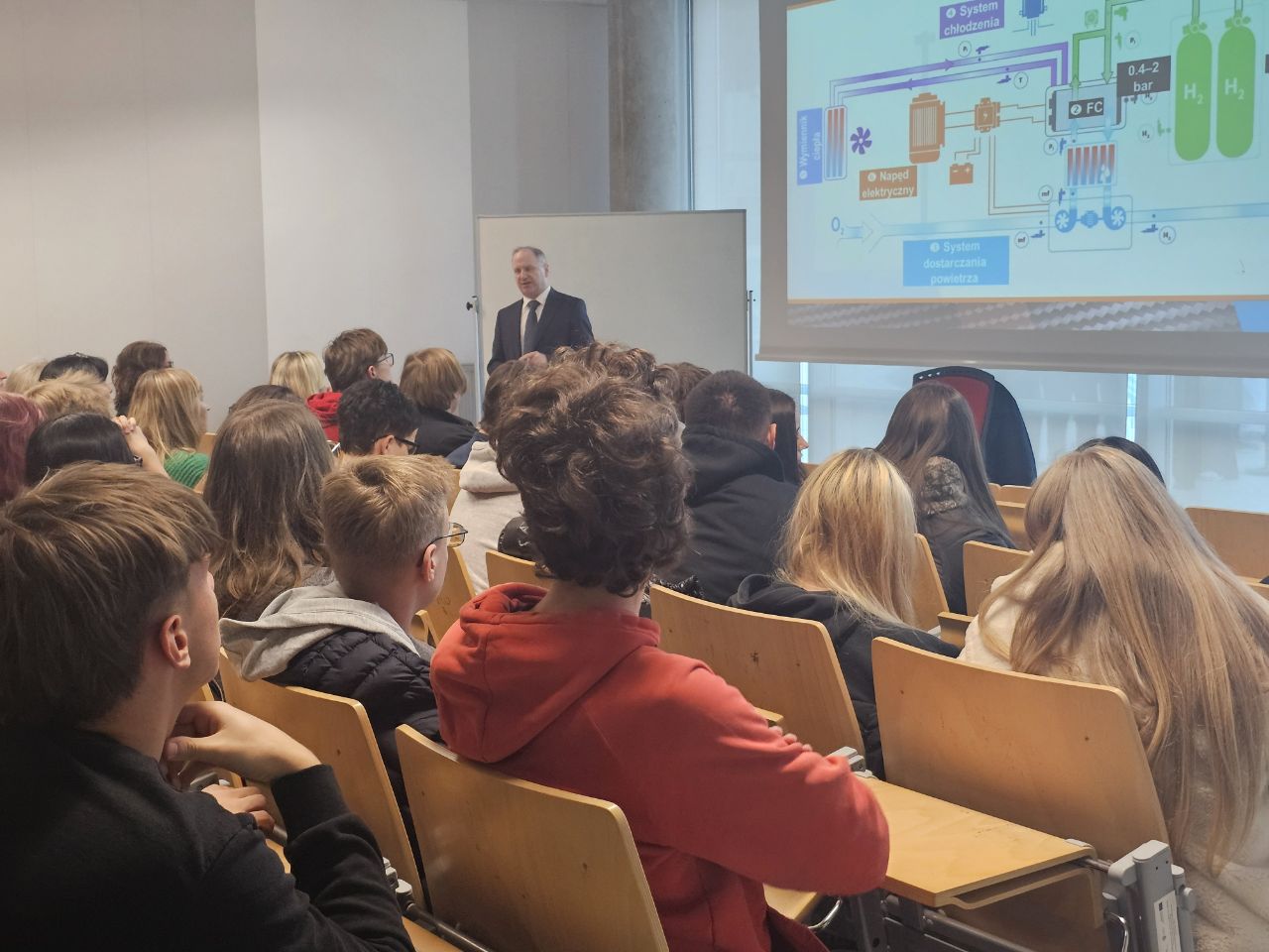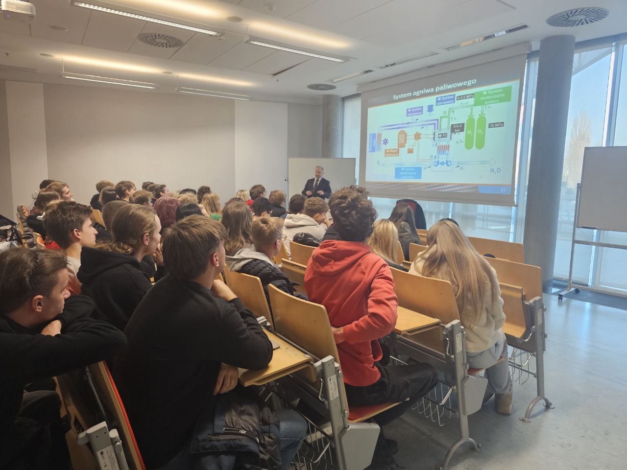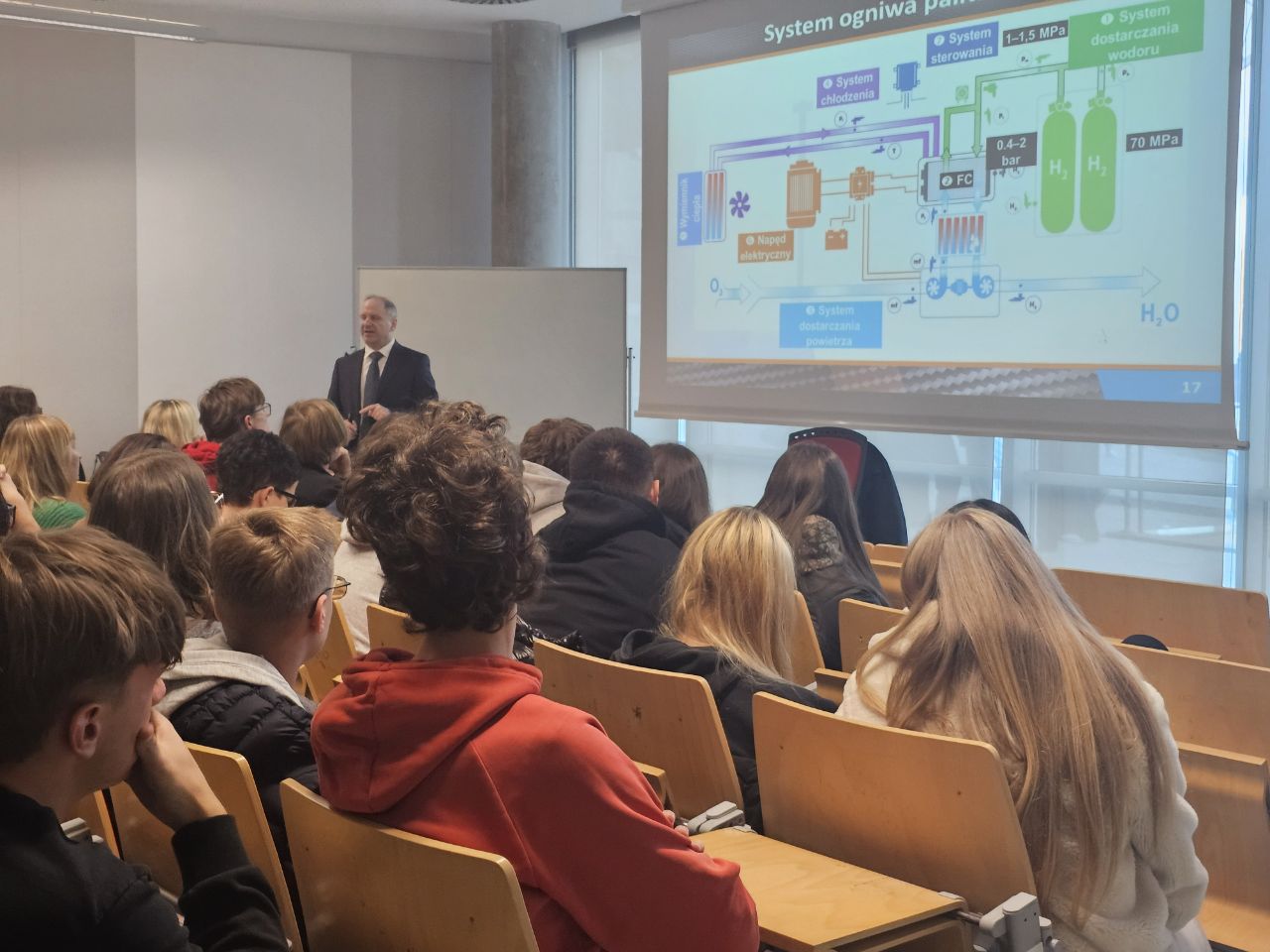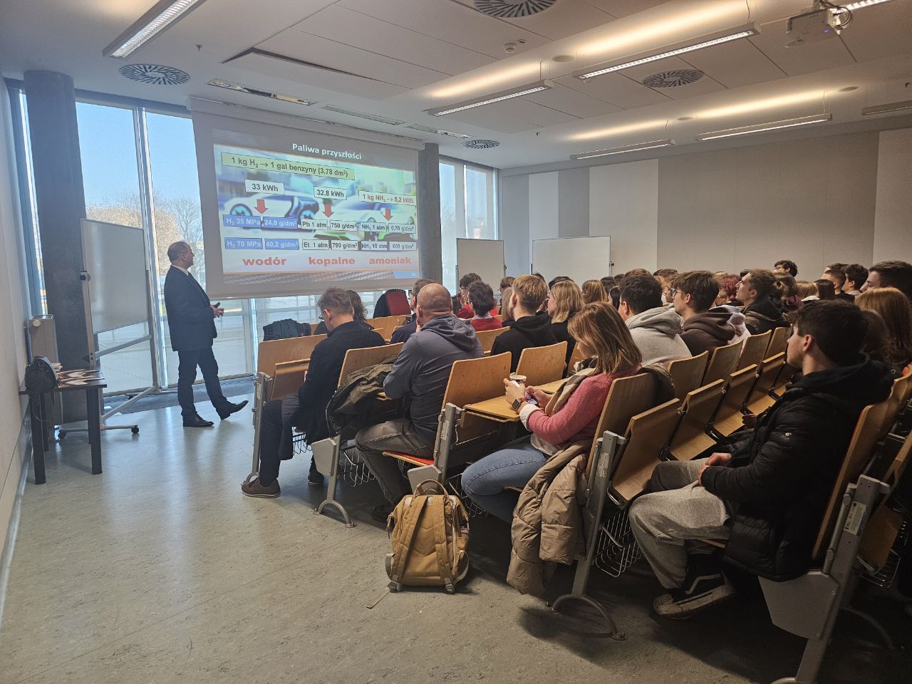 Spotkanie rozpoczął wykład prof. Ireneusza Pielechy dotyczący roli wodoru w transformacji energetycznej oraz jego zastosowań w nowoczesnych napędach. Następnie uczestnicy odwiedzili laboratoria Instytutu Napędów i Lotnictwa, gdzie: