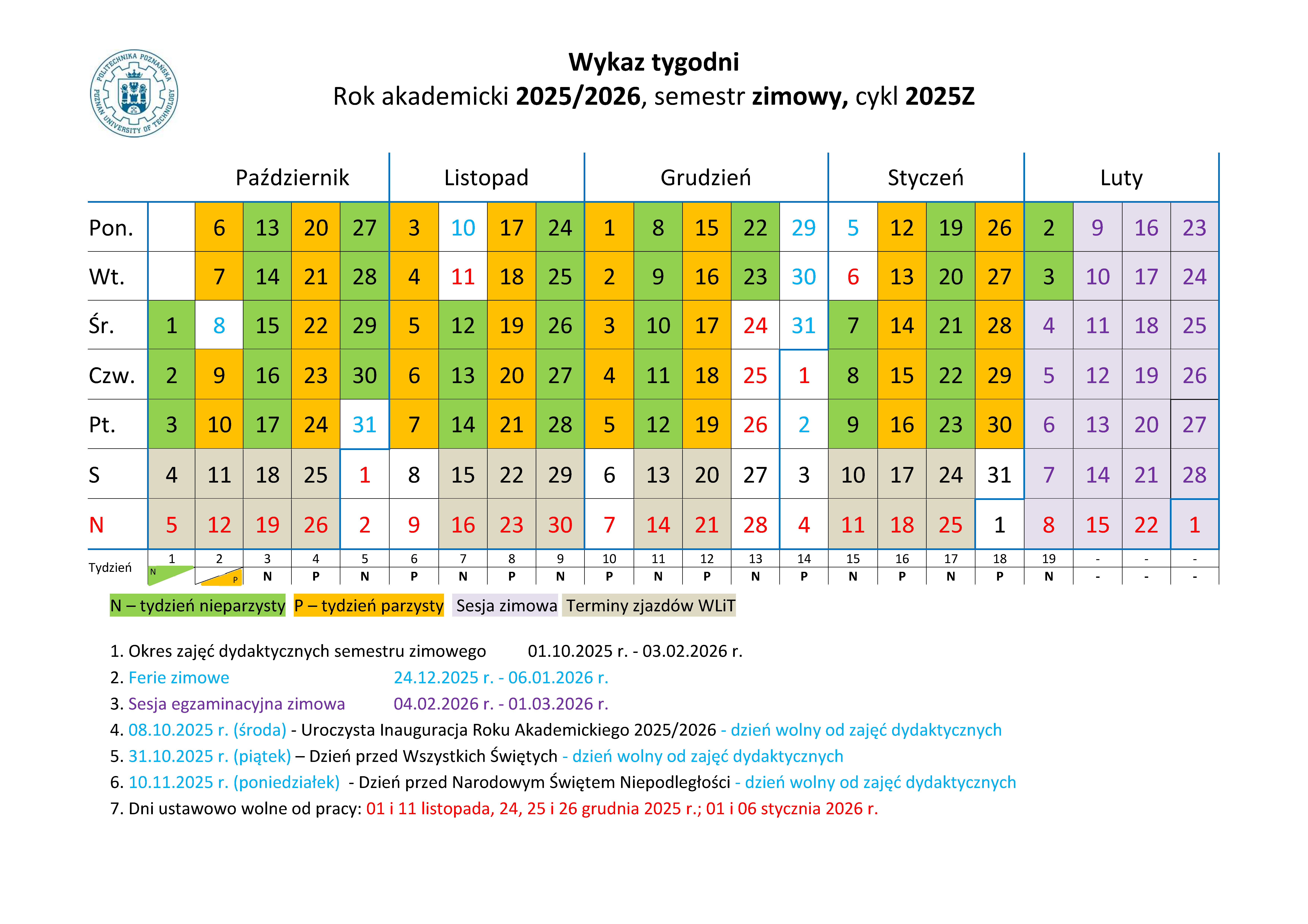 Wykaz tygodni w semestrze zimowym 2025/2026